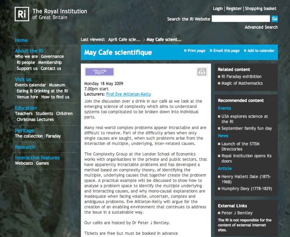 Last Monday I hosted this month’s RI Cafe Scientifique, this time on the new science of complexity with Prof Eve Mitleton-Kelly. It was a fascinating event which I think everyone enjoyed. You can listen to it by visiting the webste: