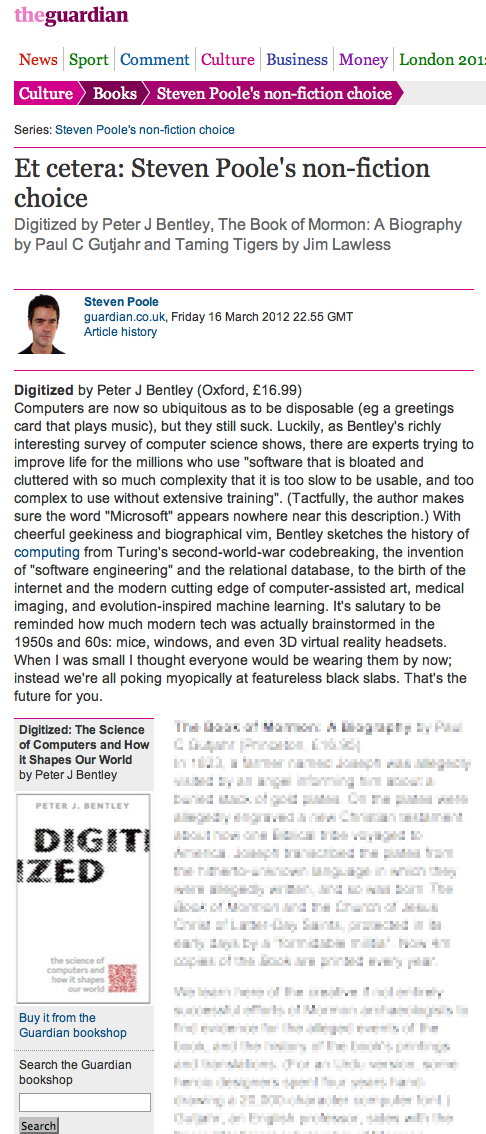My new book Digitized is just about to hit the shelves and we’ve had the first book review. It’s a nice friendly review from Steven Poole, top of his Choice column in the Guardian Newspaper book section this week. He mentions parts of the book where I describe software engineering and bloat, saying “Tactfully the author makes sure the word Microsoft appears nowhere near this description.” Rather amusingly, because of this, the automatic news bot at tmc’s online Microsoft News grabbed the review and reproduced it on their website. Anyway, we’re very pleased by this first review! You can read it in full below: