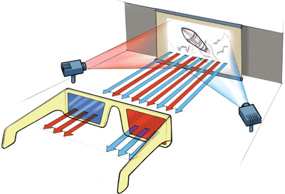 Please note that the image from "how stuff works" explaining how the 3D glasses work is incorrect. A red tint only lets red light through and a blue tint only lets blue light through.