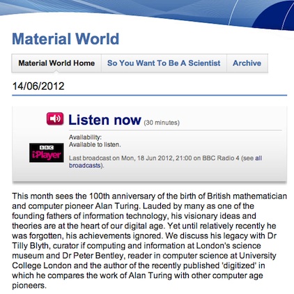 Material World is a BBC Radio 4 science show hosted by Quentin Cooper that features interviews with various scientists. This week it was my turn, appearing with the curator of a new turing exhibit in the Science Museum. We had a ten minute slot (quite a long time in radio land) where we spoke live on air. You can hear what we had to say by clicking here.