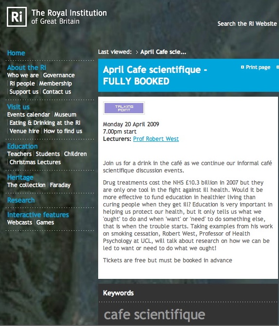 I’m now the official host of the Royal Institution’s cafe scientifique. Each month on the third Monday we have a new speaker to chat to anyone who wants to come along. It’s a nice informal way for people to discuss science with some of the world’s leading experts in comfortable surroundings. Last Monday we had Prof Robert West, one of the governments advisors and world experts on education and medicine. He specialises on tobacco and described the ways that governments, health guidance, and education can save more lives than just medical care. The RI is preparing a recording of the event so I’ll link to it when it’s done. Next month we have Eve Mitleton-Kelly from LSE talking about complex systems.